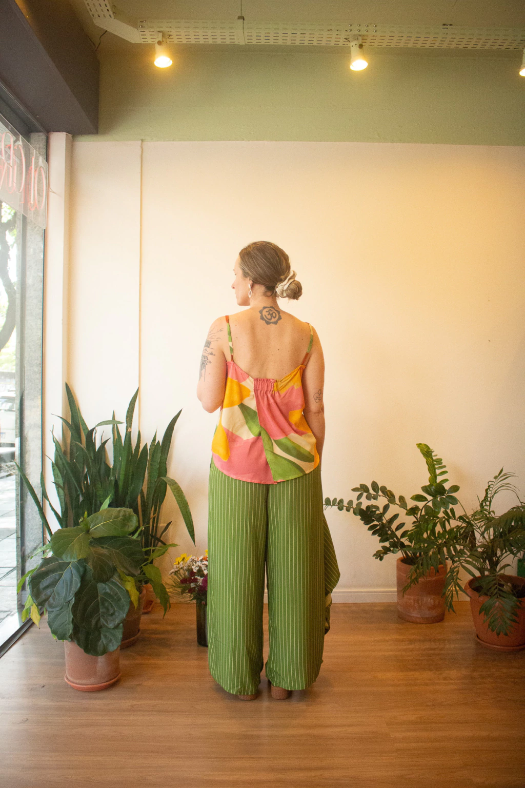 Top coringa e fresquinho que vai com tudo. Tem modelagem soltinha, alças finas e as costas transpassadas com uma abertura.
