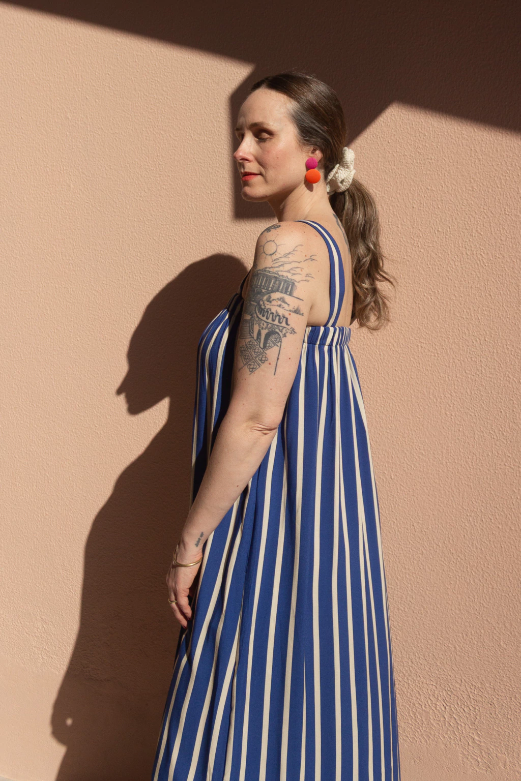 Vestido longo, confortável e fluído. Possui modelagem ampla, elástico no decote, alças largas, fendas nas laterais da barra e bolsos. Modelinho que, dependendo da estampa, vai da praia ao casamento.
